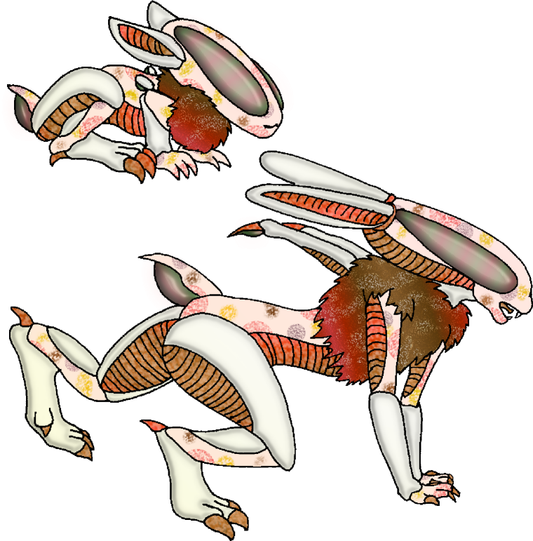 What's this? A white-yellow-pink-brown-purple xenobun scout from The Rookery. (They can link in a hivemind with other xenocreatures and shed edible chitin! Please see Zekiran#6385 for unique flavours, powers, gender, size and personality traits.)