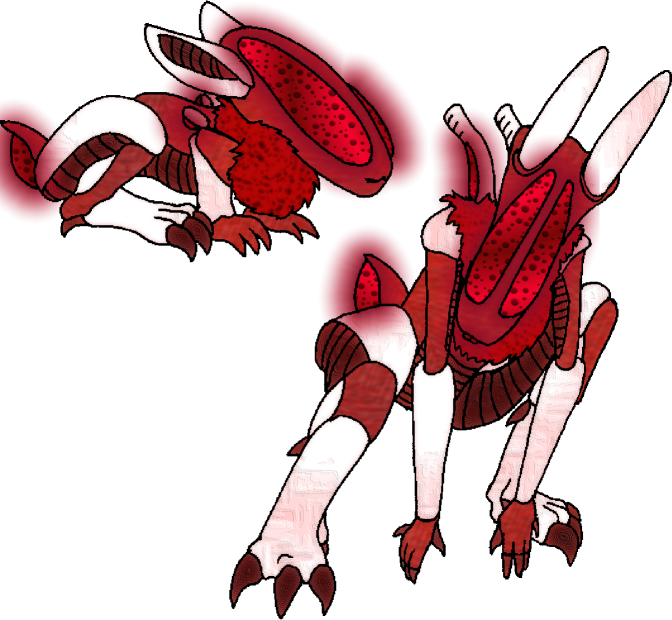 What's this? A red-pink-white xenobun queen from The Rookery. (She can link in a hivemind with other xenocreatures and sheds edible chitin! Please see Zekiran#6385 for unique flavours, powers, size and personality traits.)
