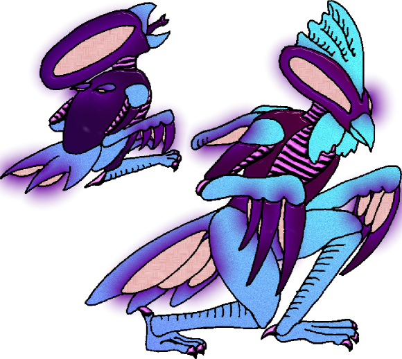 What's this? A blue-violet-pink xenochick scout from The Rookery. (They can link in a hivemind with other xenocreatures and shed edible chitin! Please see Zekiran#6385 for unique flavours, powers, gender, size and personality traits.)