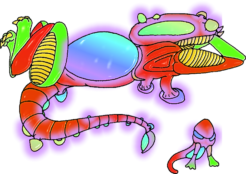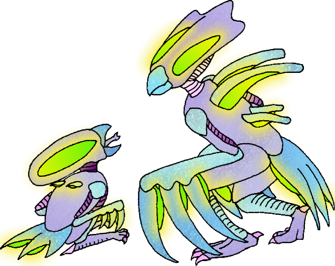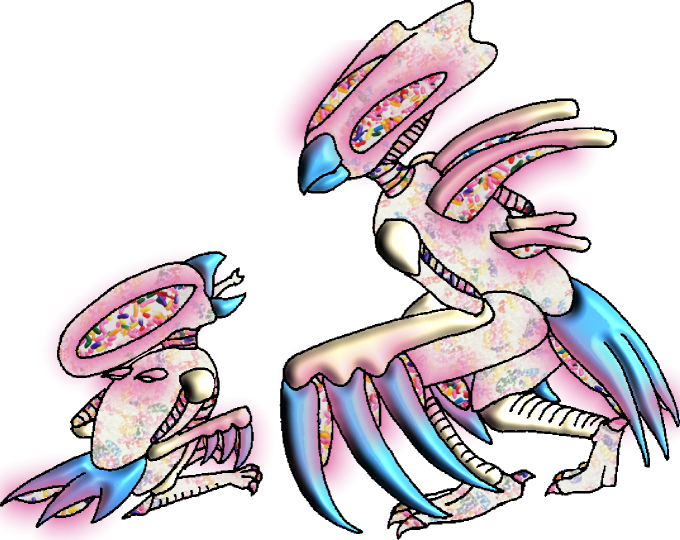 What's this? A pastel green-yellow-blue-purple xenochick queen from The Rookery. (She can link in a hivemind with other xenocreatures and sheds edible chitin! Please see Zekiran#6385 for unique flavours, powers, size and personality traits.)