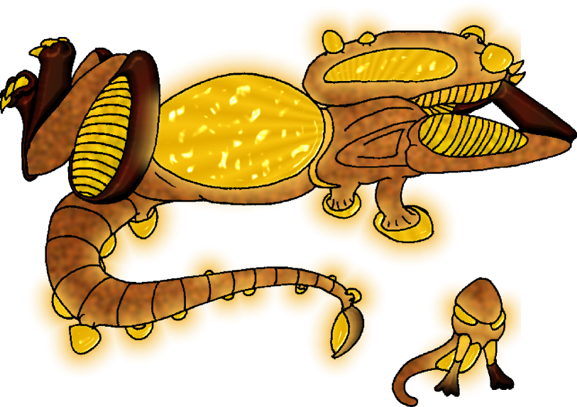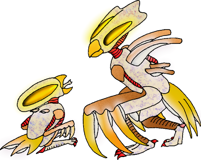 What's this? A gold-red-pink xenochick drone from The Rookery. (They can link in a hivemind with other xenocreatures and shed edible chitin! Please see Zekiran#6385 for unique flavours, powers, gender, size and personality traits.)