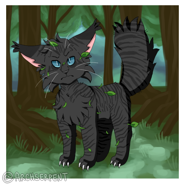 Zef is a storm bound in feline form, his charcoal-black fur etched with darker crackles that crawl across his pelt. His unkempt coat bristles constantly, standing on end with a restless static that's more emotional than literal. His blue eyes gleam electric and staring, and his forked horns rise like jagged lightning bolts from his skull, their tips glowing faintly. His wings resemble a storm petrel's -- dark, sleek, edged in white -- and his thick tail is ringed with dark bands.