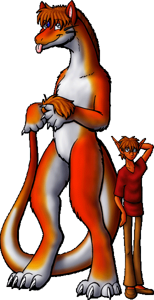 Lanky, large-pawed, and oversized, Fuego is a pup stretched into the body of a gawky adult. As a Fire Ruban, he has a vaguely draconic look about him. He walks on two long legs and has two shorter arms, carrying himself a bit like a dinosaurian raptor. His forepaws are actually hands, though his fingers are short and rather stubby, tipped with long, sharp claws. He has a long neck and an even longer tail, with a scruff of messy brown hair at one end mirrored by a scraggly brown tuft of fur at the other. A short, stiff, zebra-like mane, also brown, continues from his hair down the length of his neck. His short, multicolored fur fades in colors like a fire, white on his belly, red on his back, with orange and yellow between. Two long slits are visible on his back between his shoulder blades; these are the openings to a special set of gas sacs, the contents of which ignite upon contact with air to grant him a pair of fire-jet wings that he is entirely capable of flying with. A pair of thin black spikes grows from each of his cheekbones, and warm grey eyes flank a sapphire blue gem set naturally in his forehead. Just like Avengaean dragons, the Rubans of Rubara can naturally assume a humanoid shape, which they call their "Runian" form. More elflike than human, a Ruban's Runian form has extremely long, pointed ears, and dark markings on the face where the Ruban's cheek spikes and facial gem would normally be. Fuego has ruddy, somewhat orangey skin in his Runian form, marked with darker brown for his spike- and gem-spots, while his eyes and hair go unchanged. He is about six and a half feet tall in this shape, thin and long-limbed to the point where he almost seems to be a living caricature. His face is narrow and his nose is long and thin, though his eyes are large and rather puppyish, and his ears are comically oversized. His attire is simple, with a baggy dark red tunic cinched at the waist with a drawstring for his torso, loose brown slacks for his legs, and brown moccasins for his feet. |