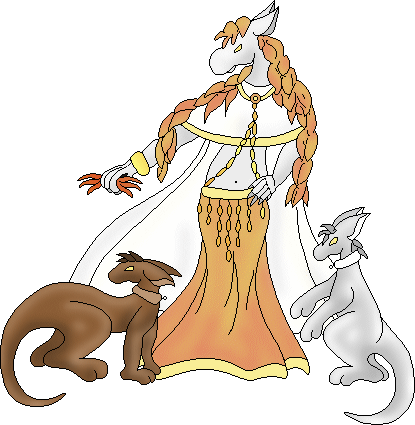 Though she can summon many more than just two, there are a specific pair of hound-dragons that are Chisanna's constant companions. Neither Bile, a brown male, nor Gaul, a white male, have much in the way of individual personality, though there is more that differs between them than just looks. Both are quiet and steadfast in their loyalty, but in moments where there is nothing required of them, Gaul is a little more active than Bile is.